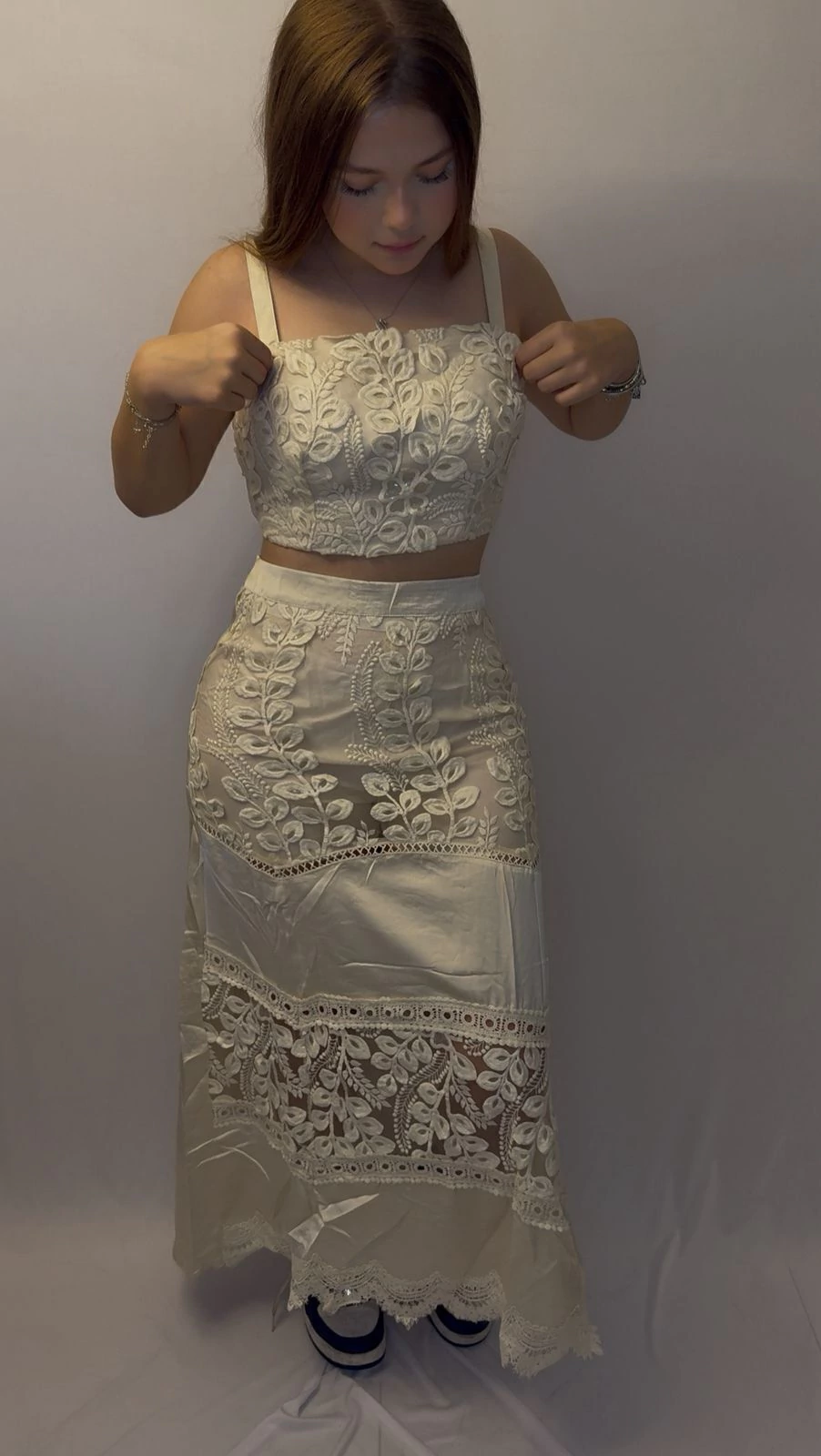 Conjunto de saia em cetim com bordado delicado, perfeito para ocasiões especiais. A saia em corte coss possui zíper invisível na parte de trás, garantindo acabamento sofisticado, saia possui shorts na parte de baixo. O top combina o mesmo tecido com bordado, apresenta alças largas e reguláveis, e conta com bojo e possui elastex na parte de trás do cropped para maior conforto e ajuste perfeito. Um conjunto elegante e confortável para você arrasar!